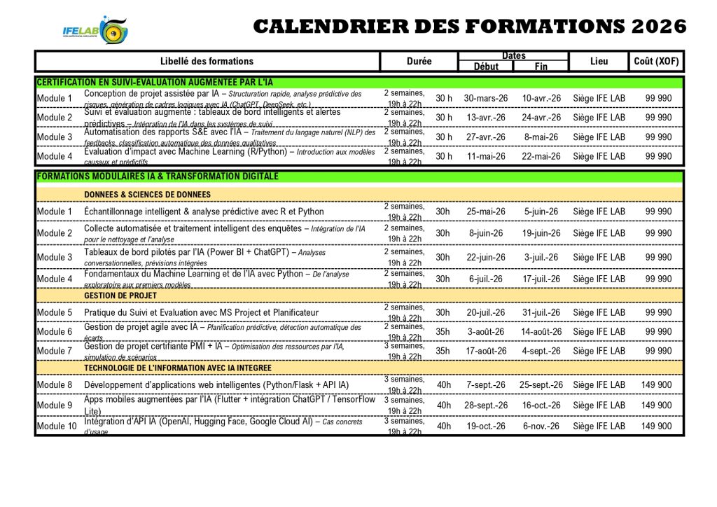 Dans cette dynamique, le cabinet IFE LAB lance son Calendrier des Formations 2026, un programme structuré de formations modulaires visant à renforcer les compétences des professionnels dans des domaines clés de la transformation numérique et du pilotage stratégique des projets.