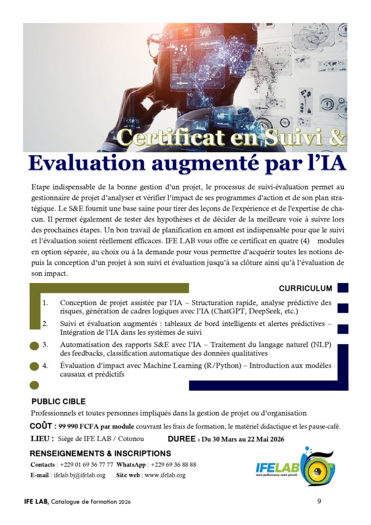Après 08 années d’expérience dans la formation en suivi – évaluation et domaines connexes, le Cabinet IFE LAB pour répondre à ces nouveaux défis lance la Certification en Suivi-Évaluation Augmentée par l’Intelligence Artificielle, une formation innovante qui combine les fondamentaux du S&E avec les technologies avancées d’analyse de données et d’automatisation.